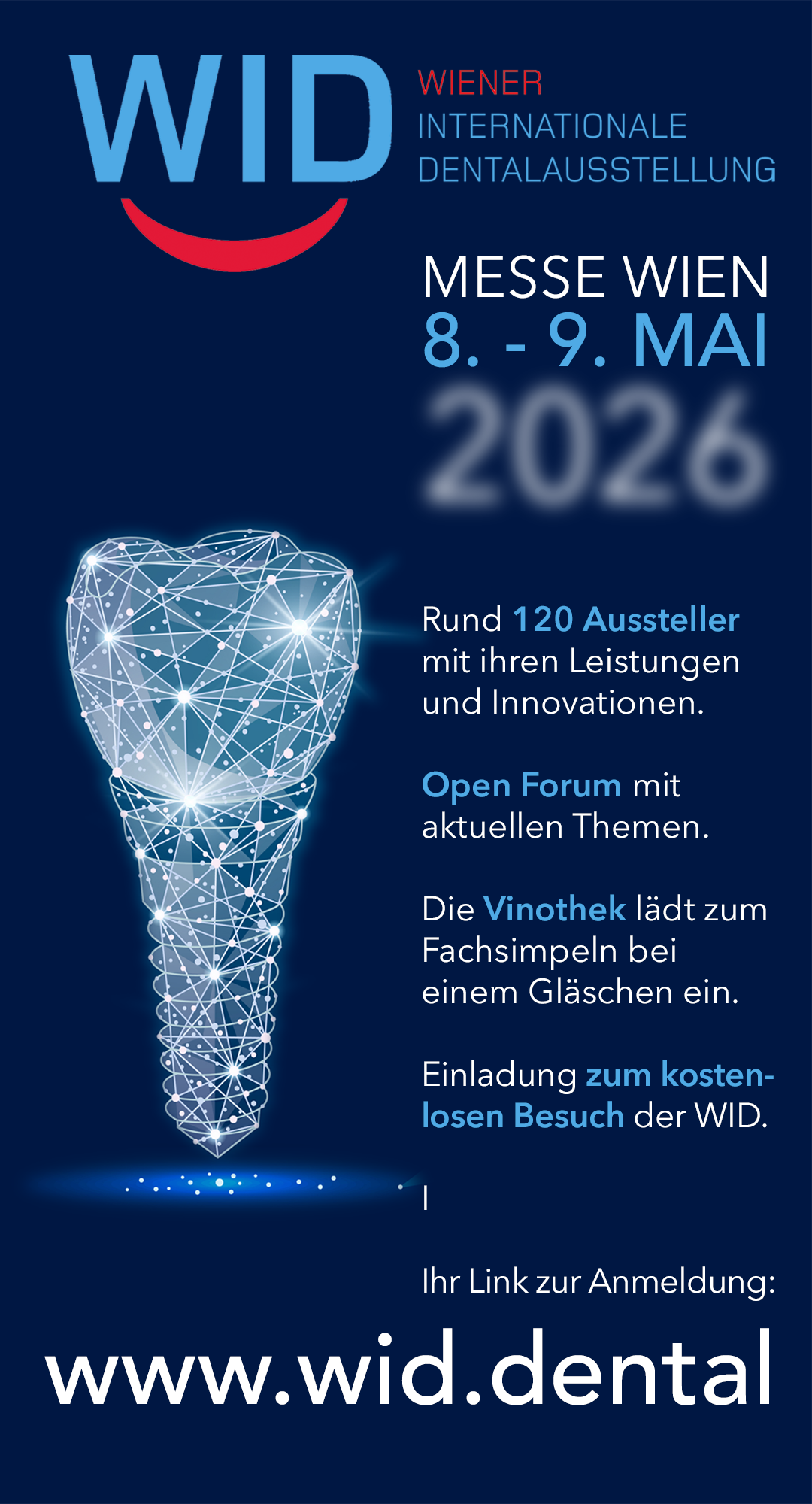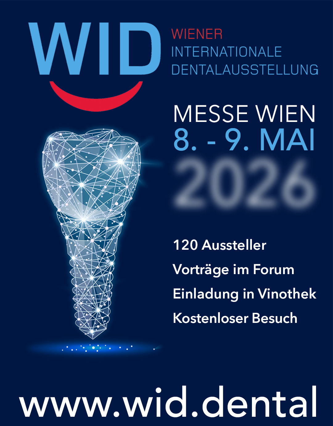 Die WID wird vom Veranstalter, ODV - Österreichischer Dentalverband, umfassend beworben, wie zum Beispiel durch laufende Pressemitteilungen, Inseraten in Fachmedien, Kooperationen mit befreundeten zahnmedizinischen Fachverbänden. Unsere Aussteller erhalten die Möglichkeit sich im Ausstellungskatalog zu präsentieren. Weiters können Sie das Logo sowie den Banner für Ihre Website respektive für Ihre E-Mail verwenden.